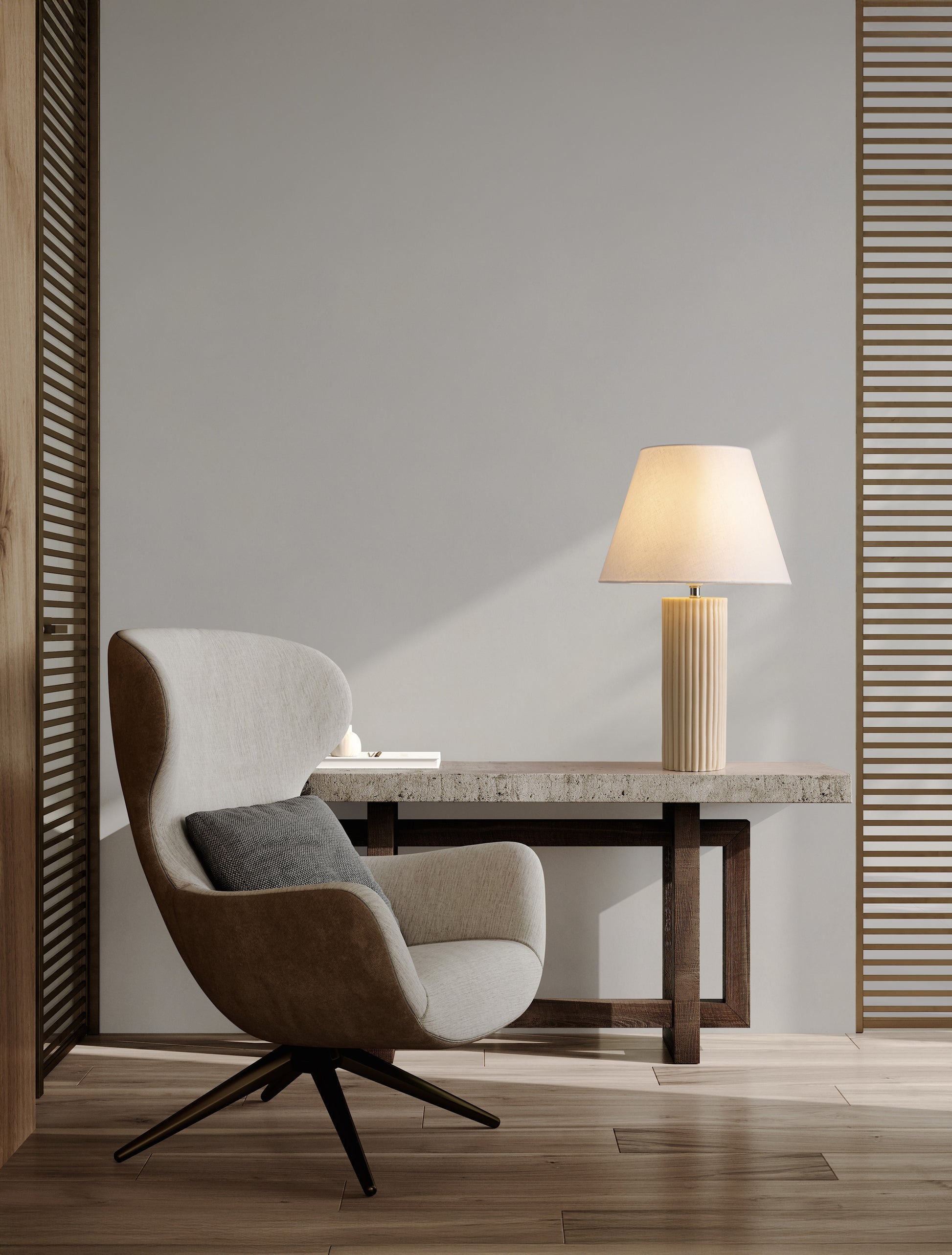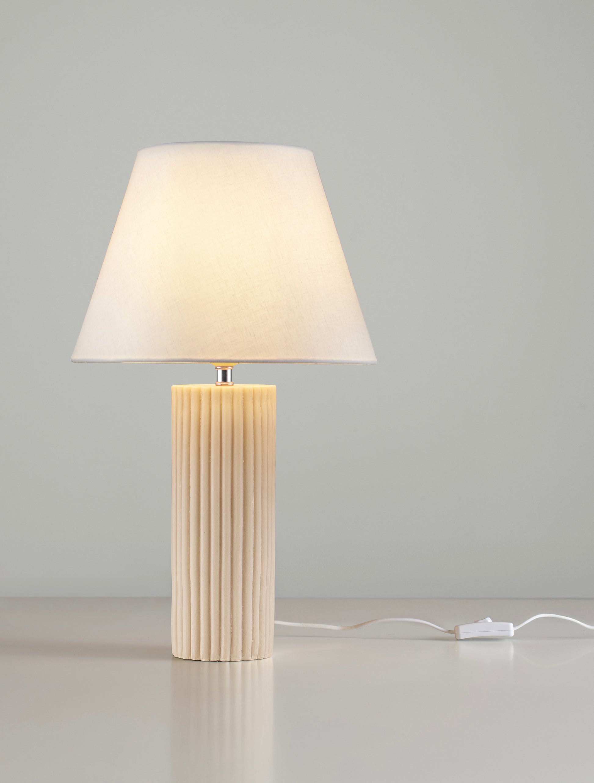 - Material: Beige kamskjellstein (støpt) og stoffskjerm