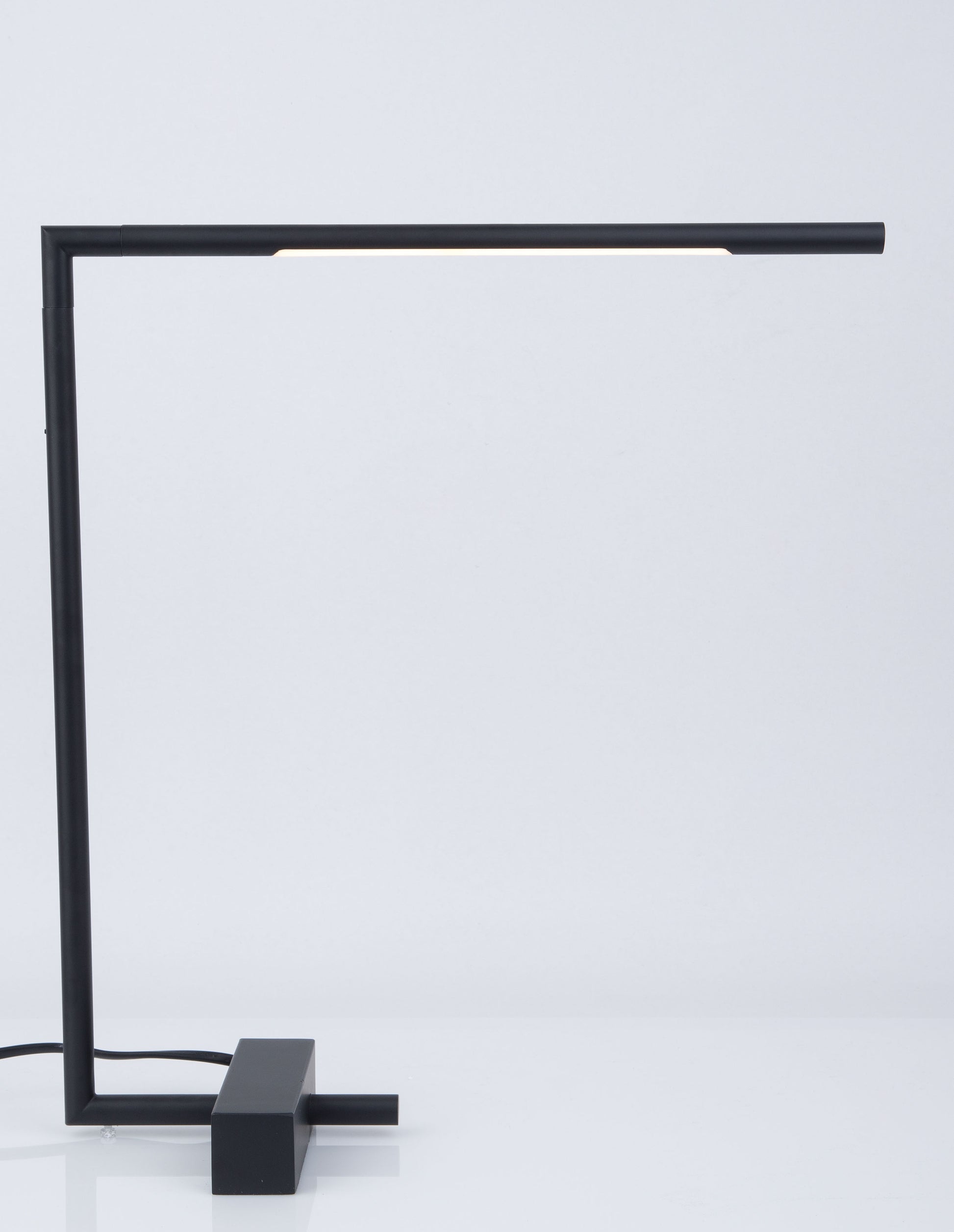 En moderne bordlampe konstruert av svart metall og akryl, som bruker en energieffektiv LED-lyskilde.