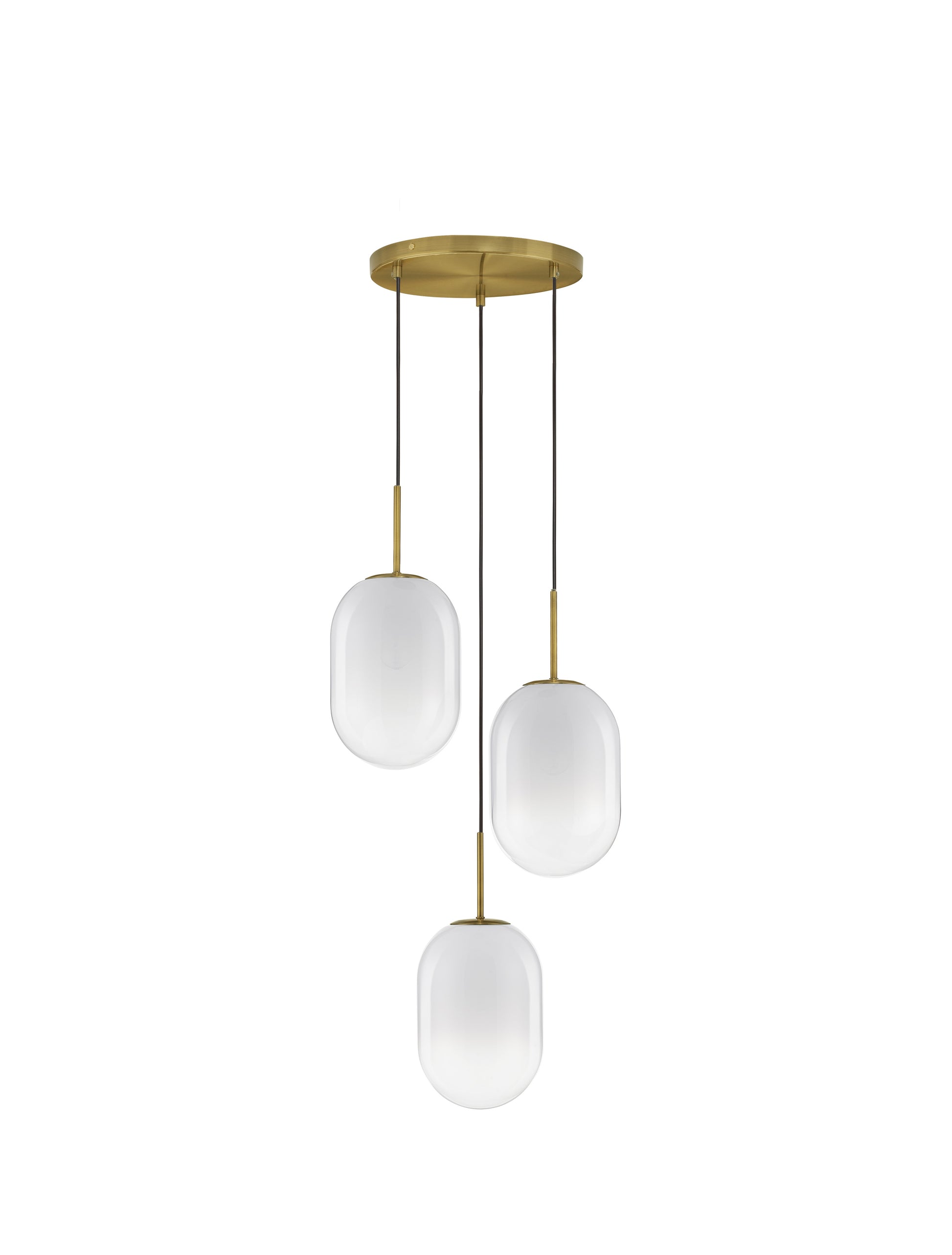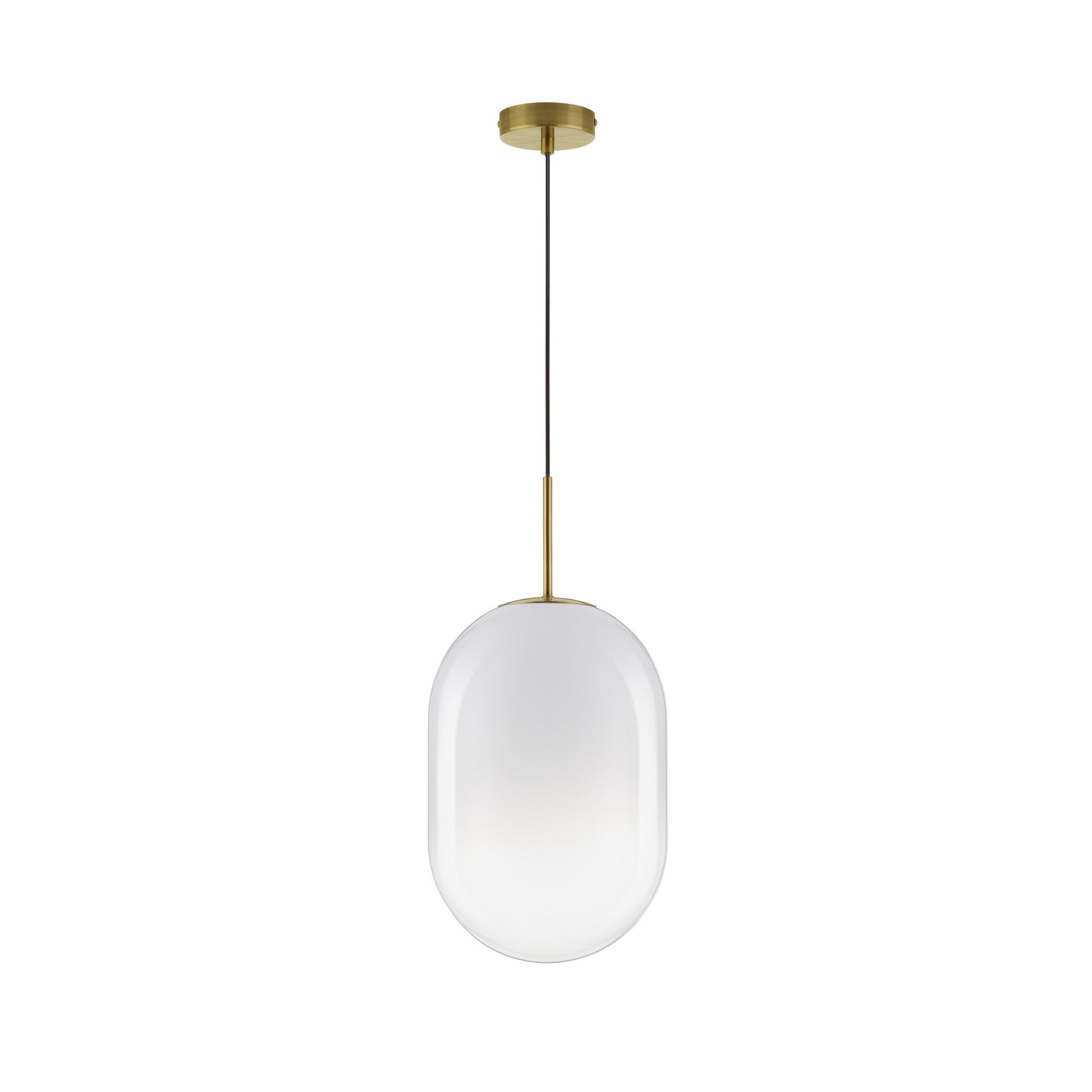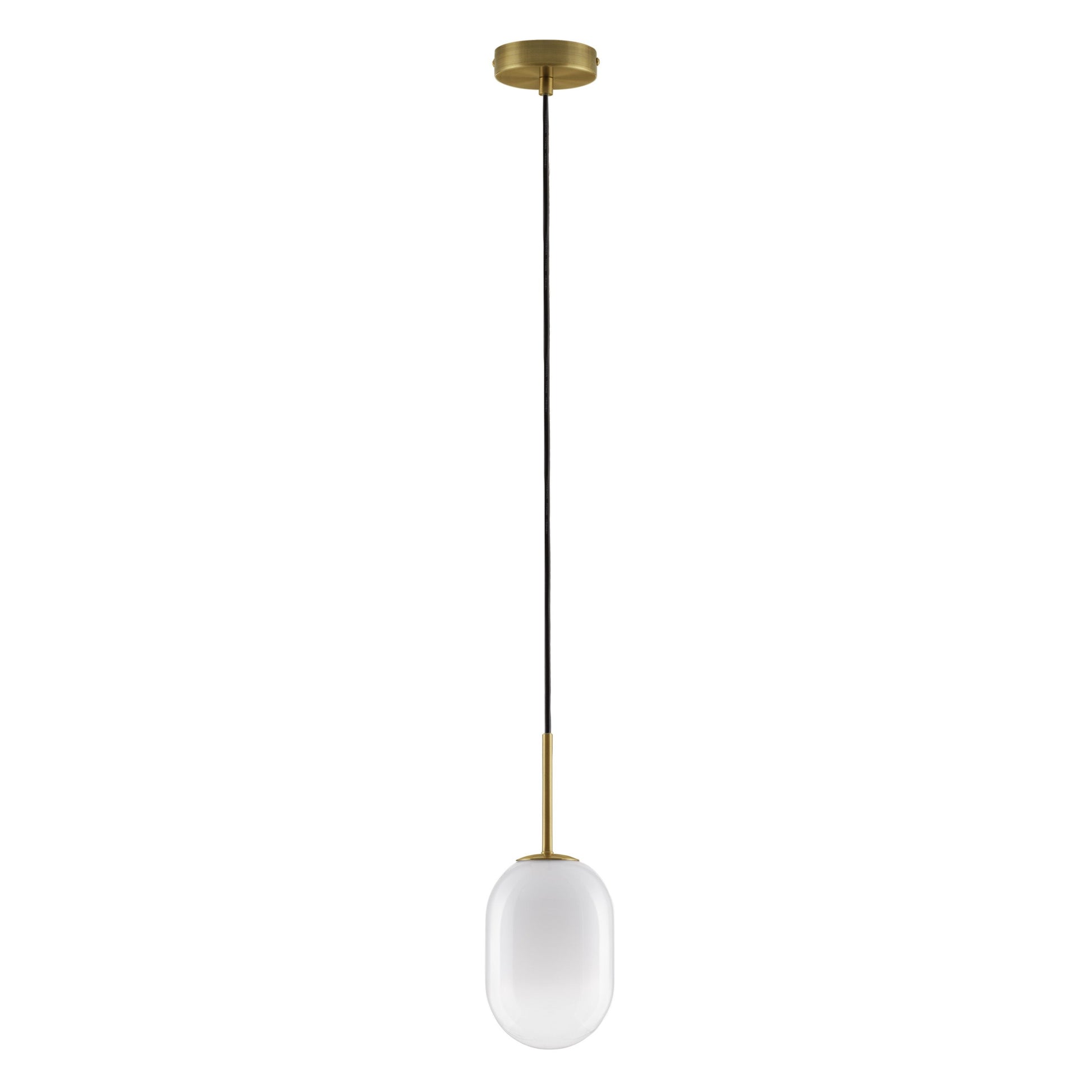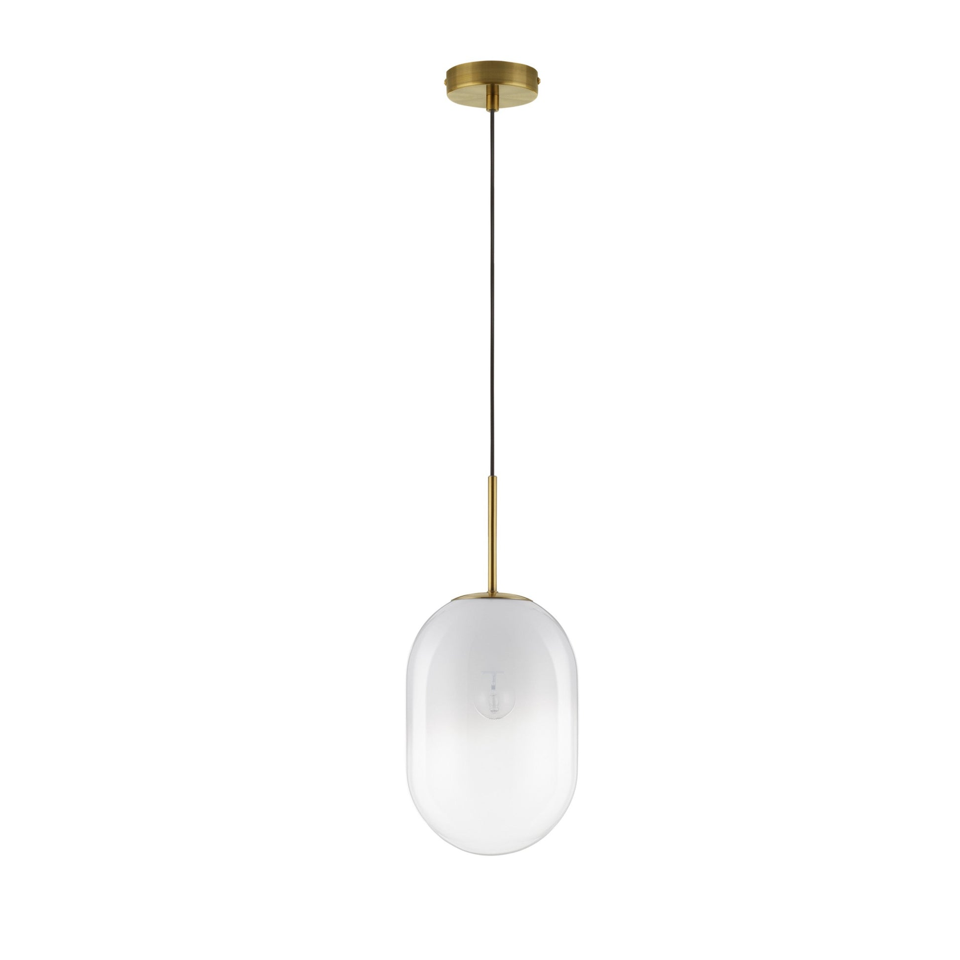 Chrysi har en enkel og elegant design med en slank messingstang som bærer en kuleformet skjerm i hvitt glass. Den gradiente overflaten på glasset gir lampen et unikt og moderne utseende. Det hvite glasset sørger for en jevn og behagelig lysfordeling.