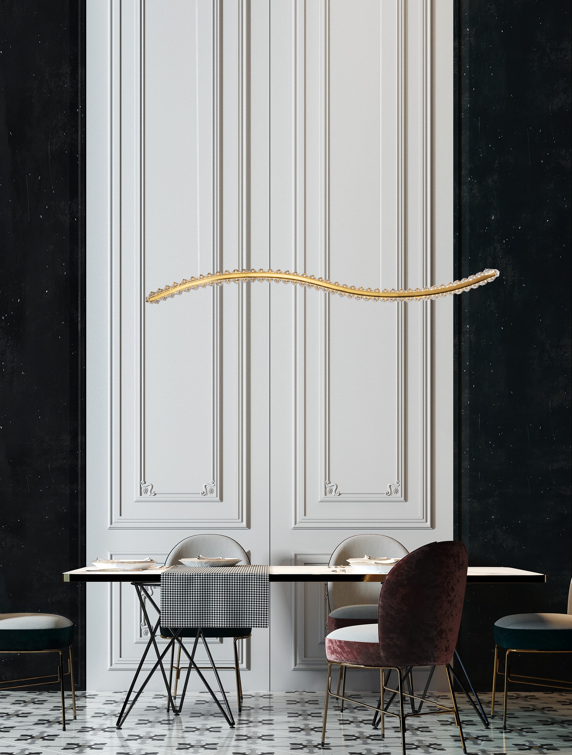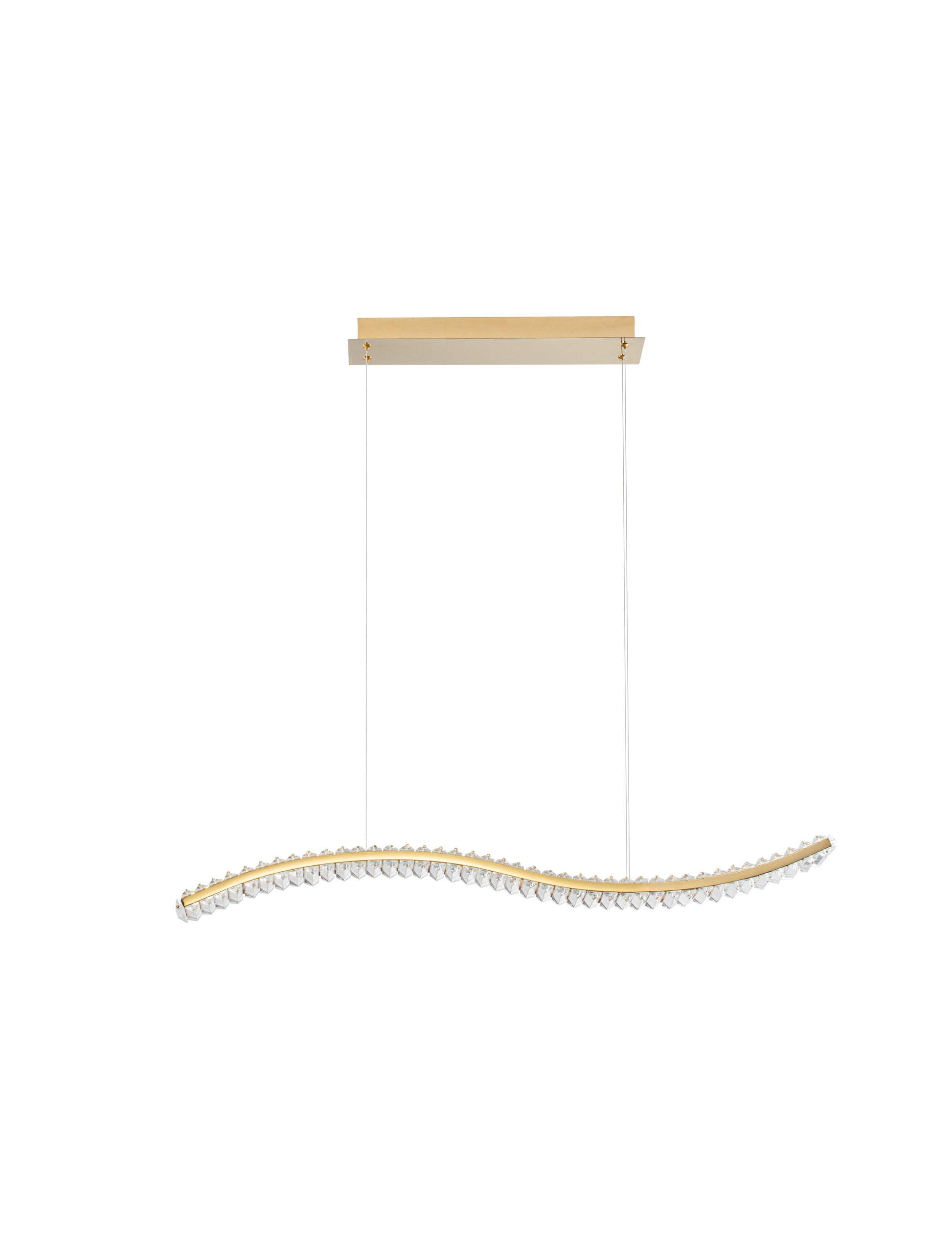 Den buede formen og de glitrende krystallene skaper en følelse av bevegelse og dynamikk. Det skinnende gullet gir lampen en luksuriøs og eksklusiv utstråling.