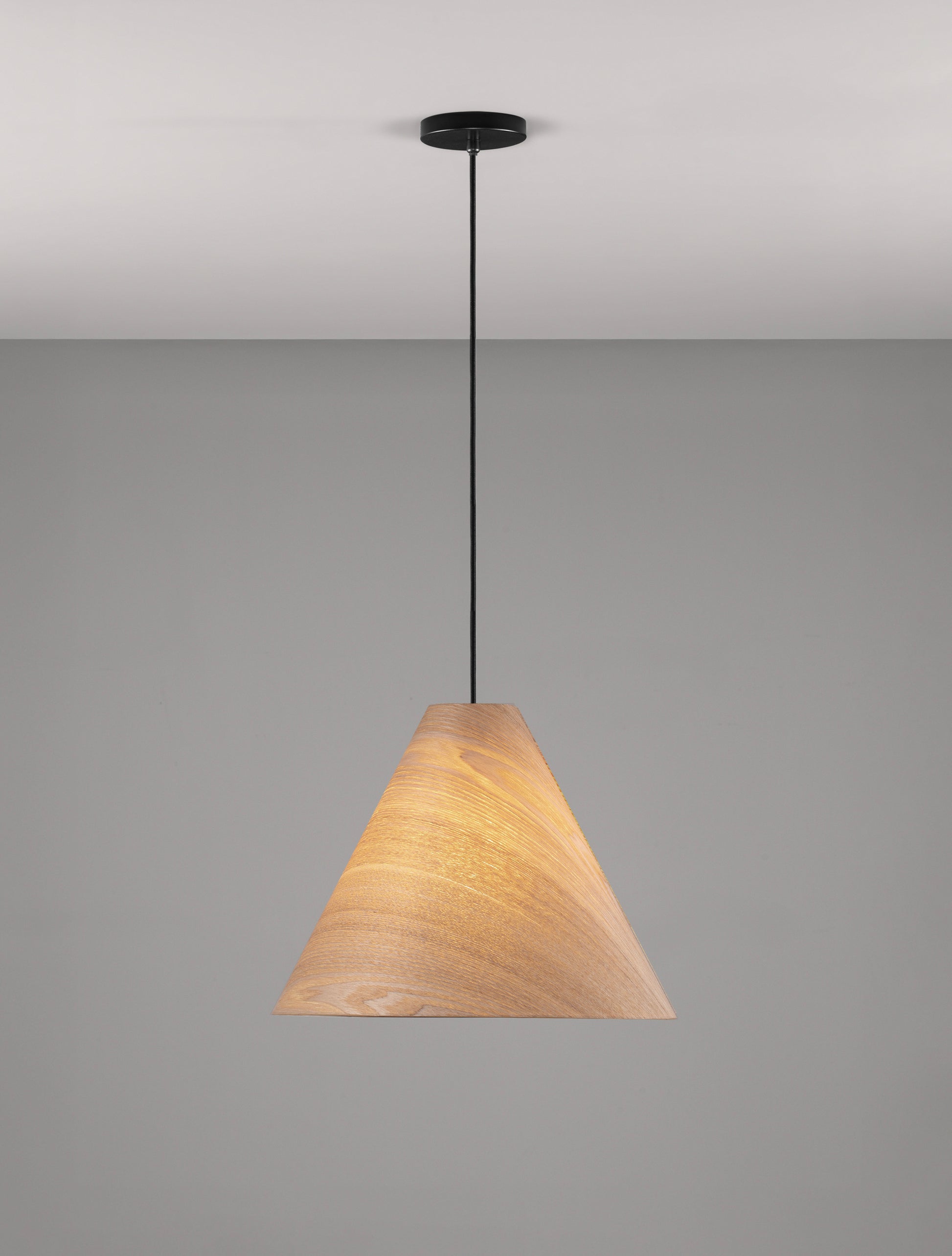 Lampen har en konisk form som gir den et elegant og minimalistisk utseende. Den er laget av lyst treverk som gir en varm og innbydende følelse. Den sorte ledningen gir en fin kontrast til det lyse treverket og fullfører det moderne utseendet.