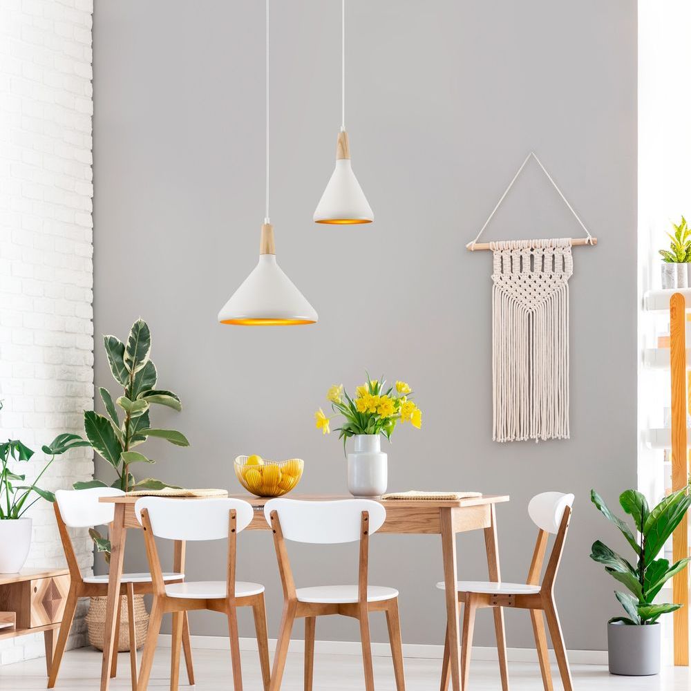 Denne vakre pendellampen kombinerer funksjonell design med naturlige materialer og skaper en varm og innbydende atmosfære i ethvert rom. Med sin unike kombinasjon av hvit aluminium, detaljer i gull og naturlig tre, blir den et elegant blikkfang i hjemmet ditt.