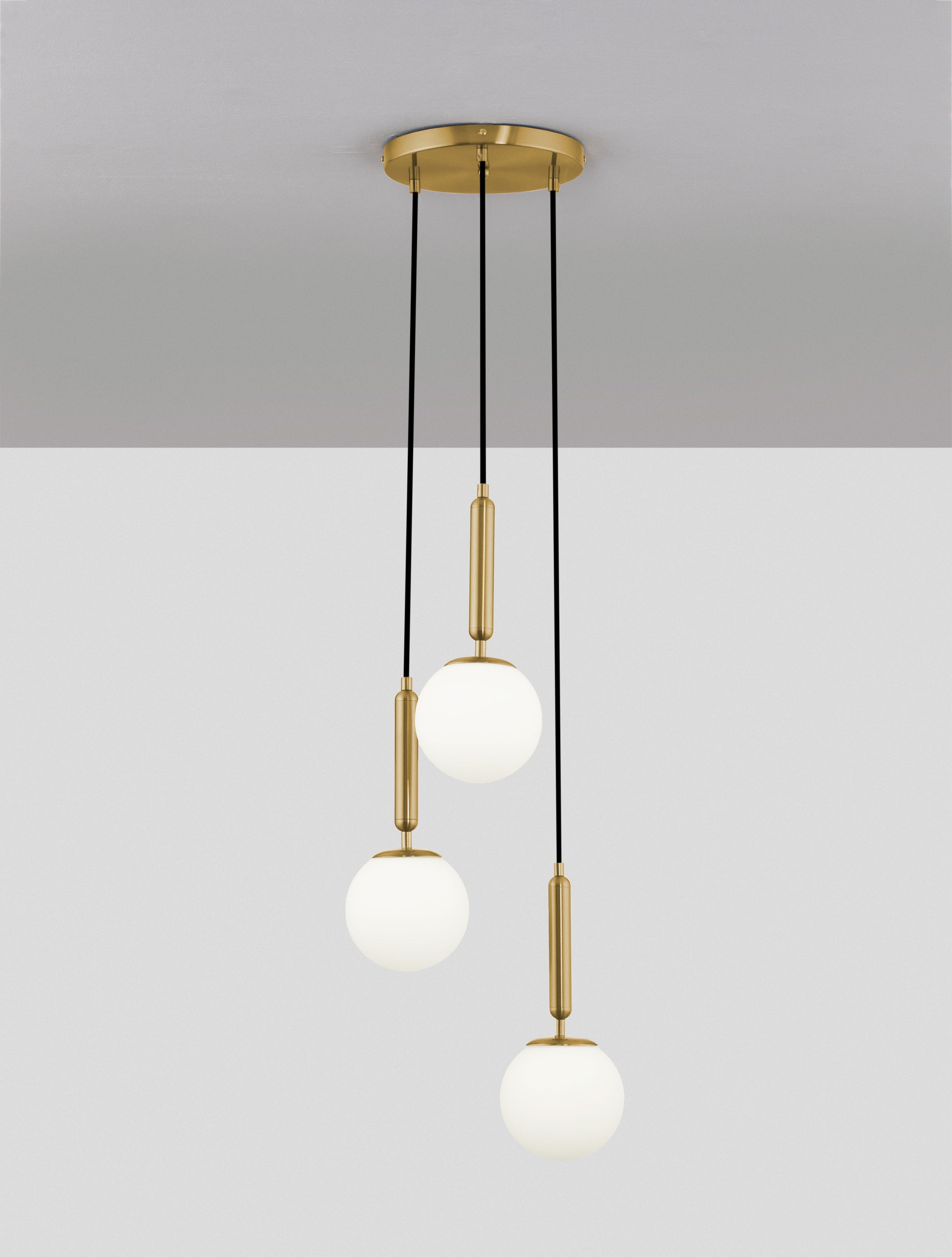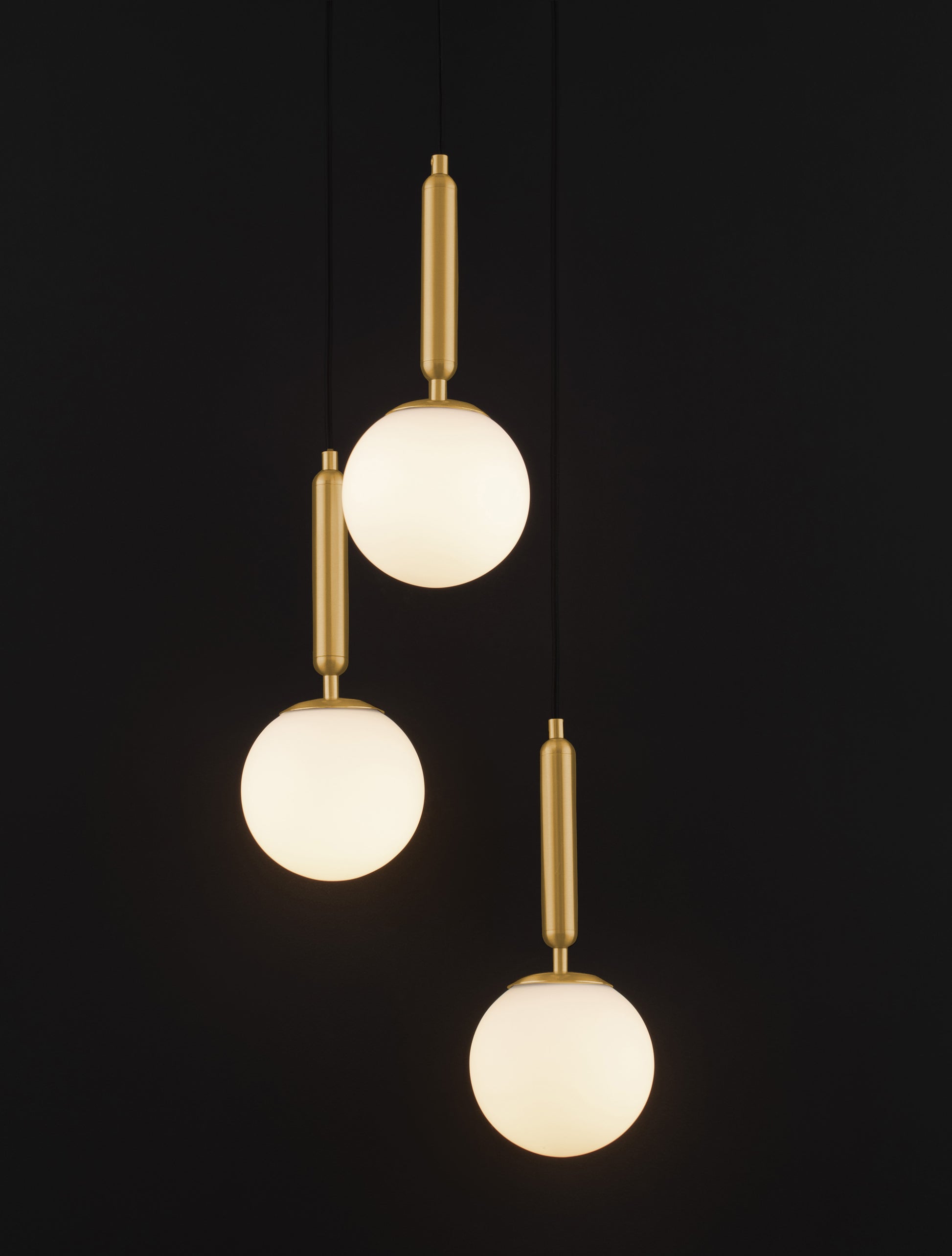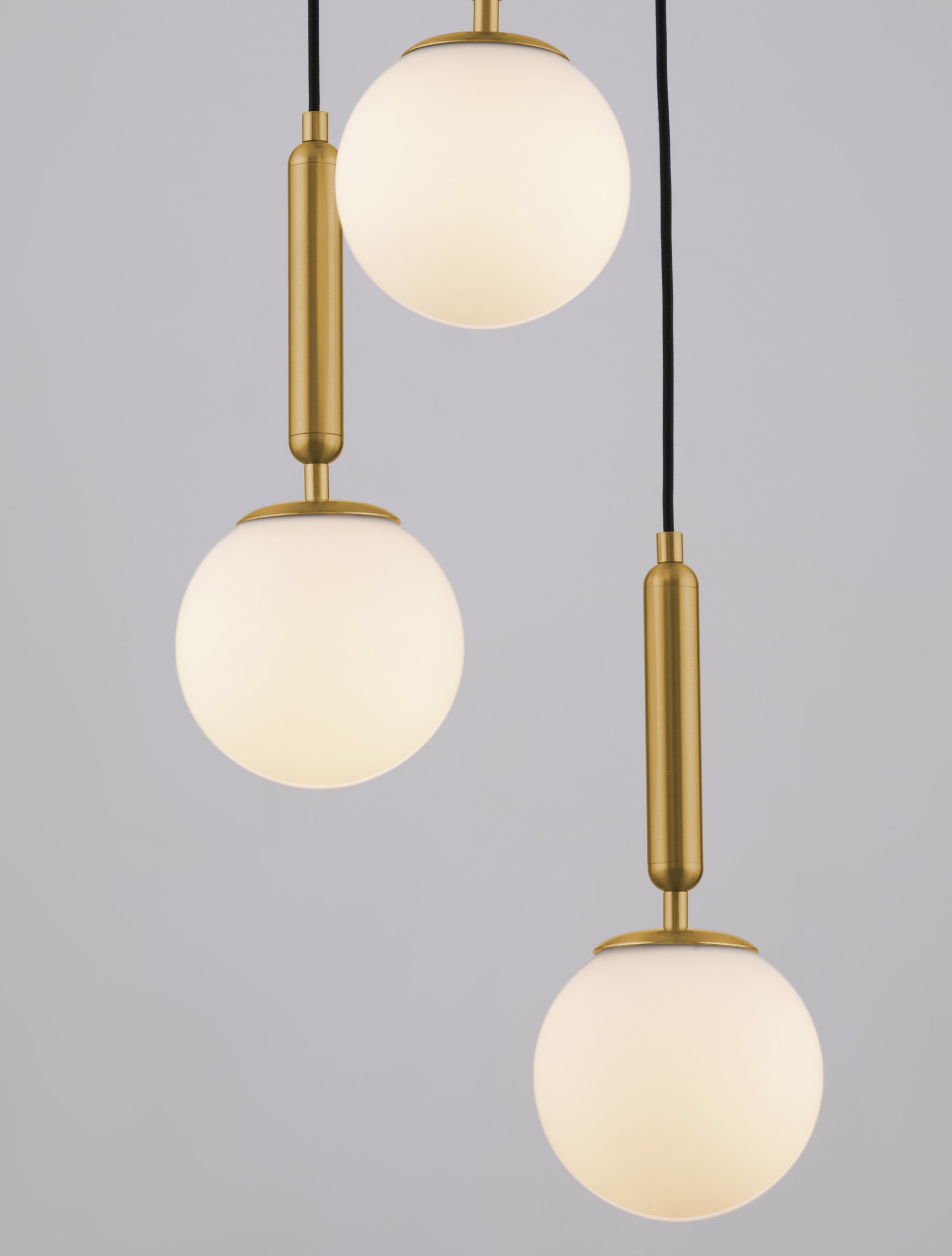 MONET har et elegant design med tre opalglass-skjermer som henger fra en messingfarget metallplate. De hvite glasskjermene gir et mykt og behagelig lys, mens de messingfargede detaljene gir lampen et sofistikert og eksklusivt utseende.