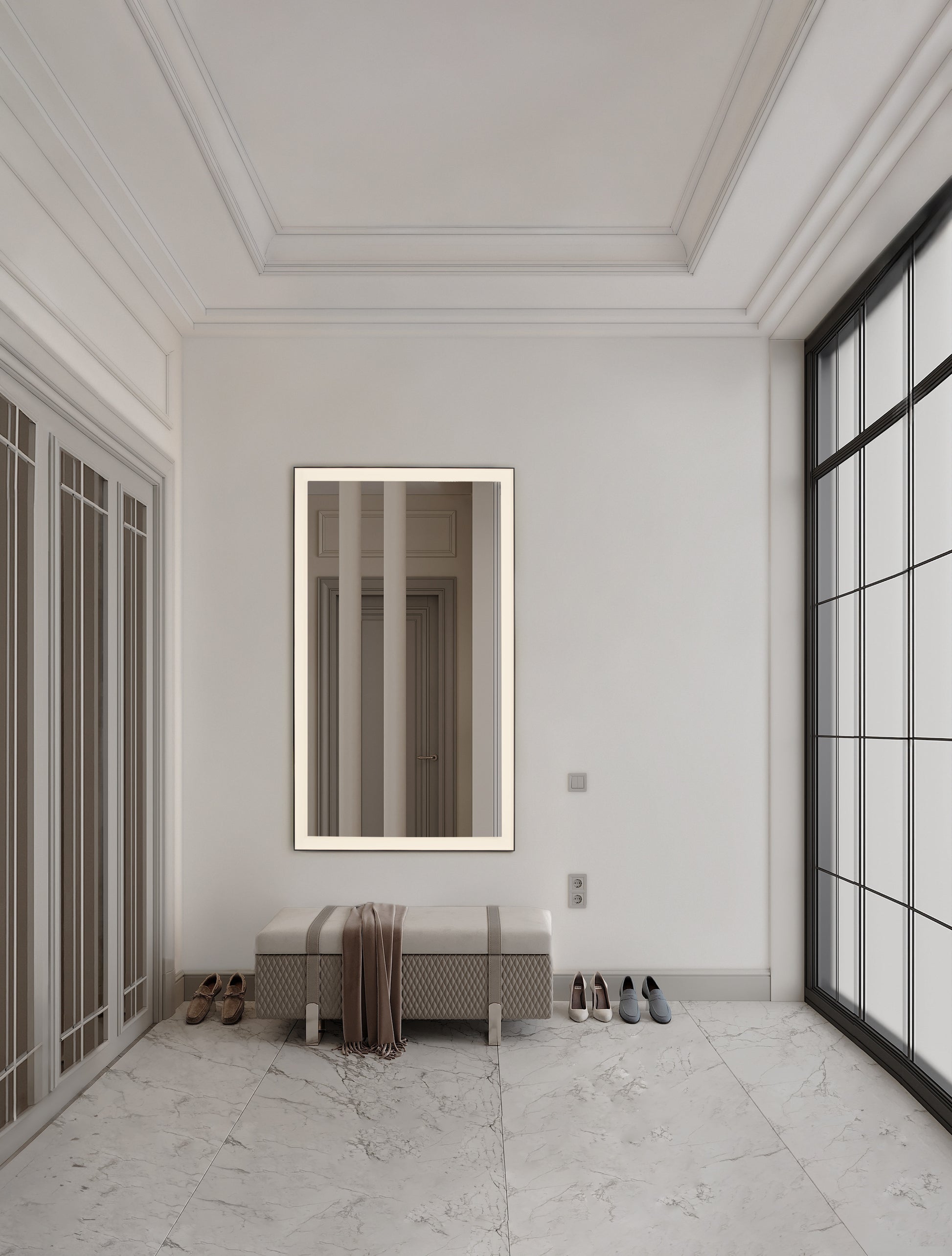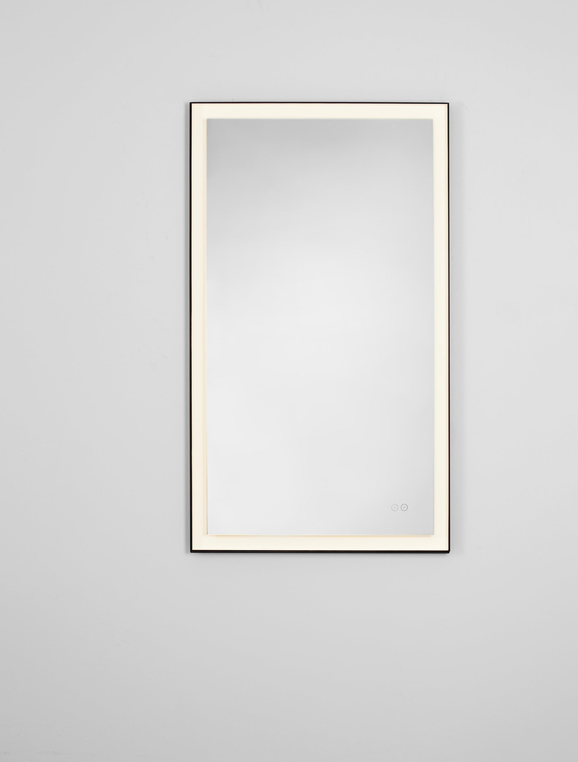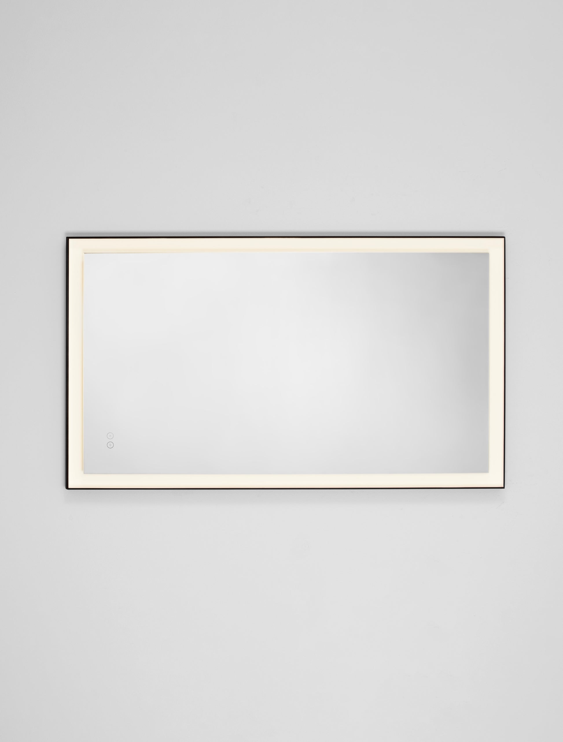 Speilet har en rektangulær form som passer godt inn i de fleste rom. Den sandblåste, sorte aluminiumsrammen gir speilet et moderne og industrielt utseende, samtidig som den beskytter speilet mot skader. Den integrerte LED-belysningen gir et jevnt og behagelig lys, perfekt for både funksjonell og stemningsfull belysning.