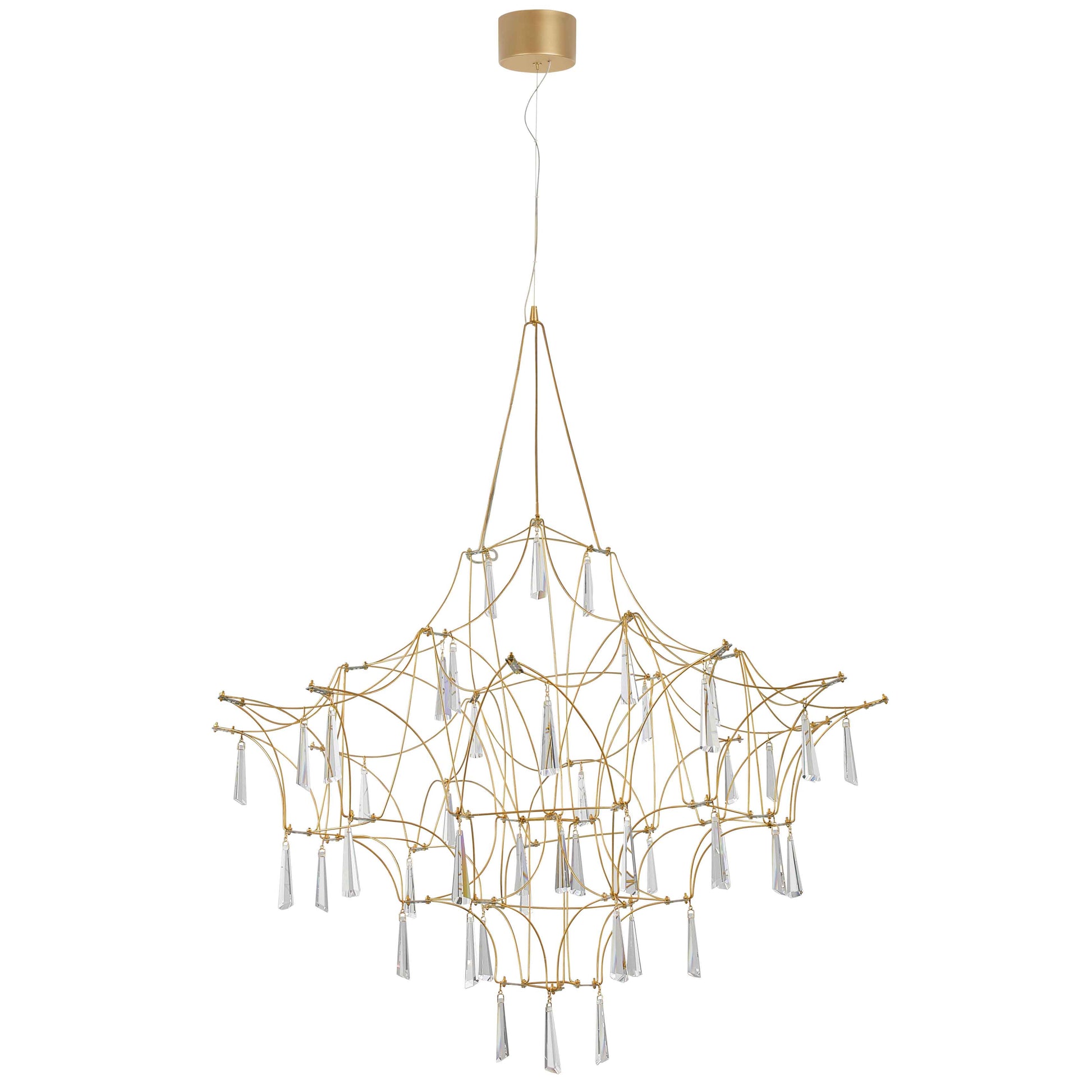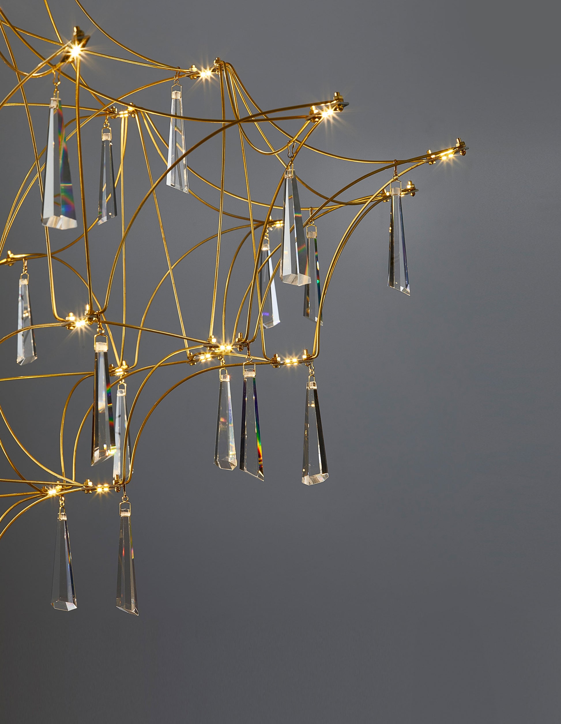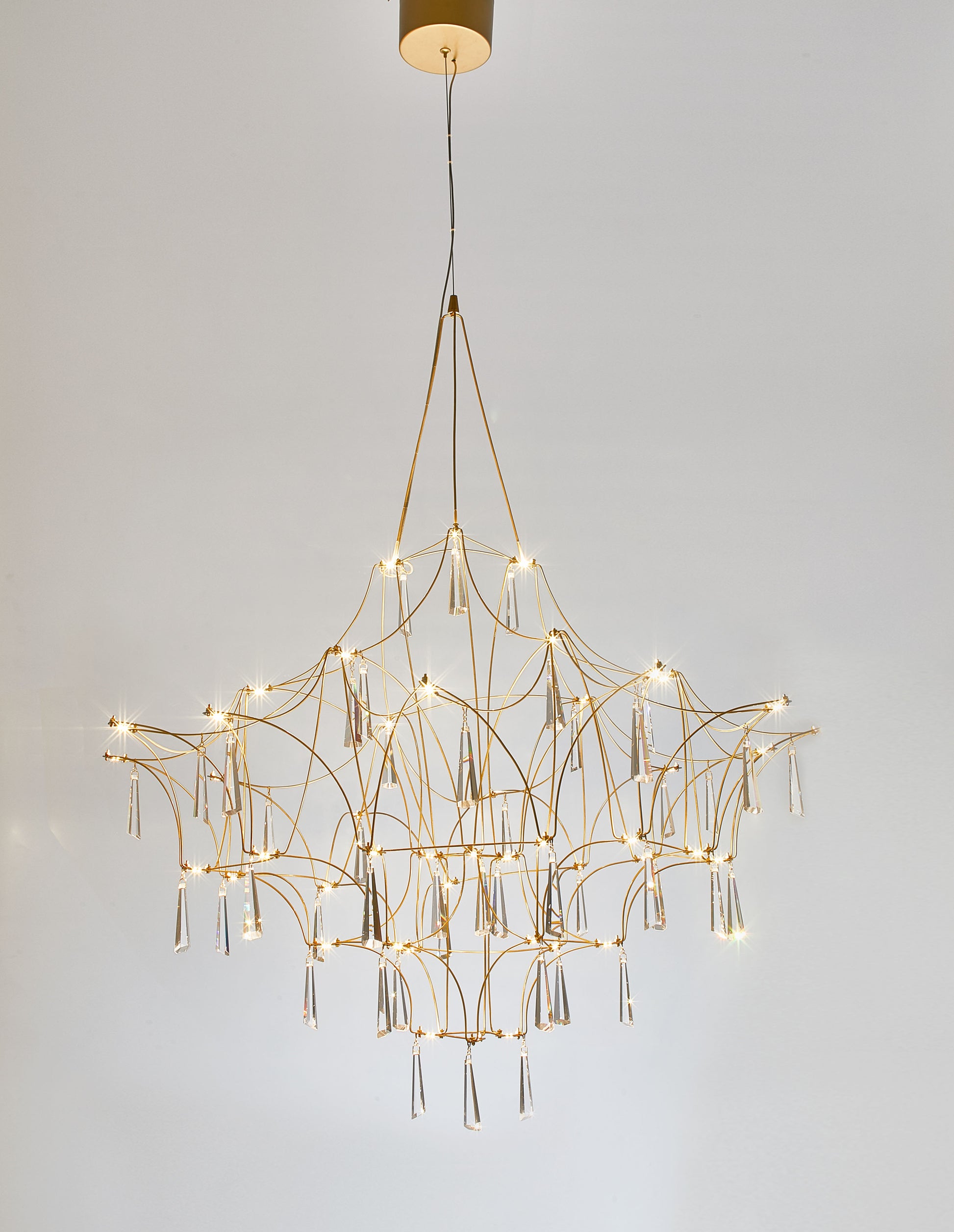 Goro lysekronen har et unikt og iøynefallende design med en struktur i gullfarget metall som bærer vakkert slepne, klare krystaller. Krystallene fanger og reflekterer lyset på en måte som skaper et magisk lysspill og gir en følelse av luksus og raffinement.