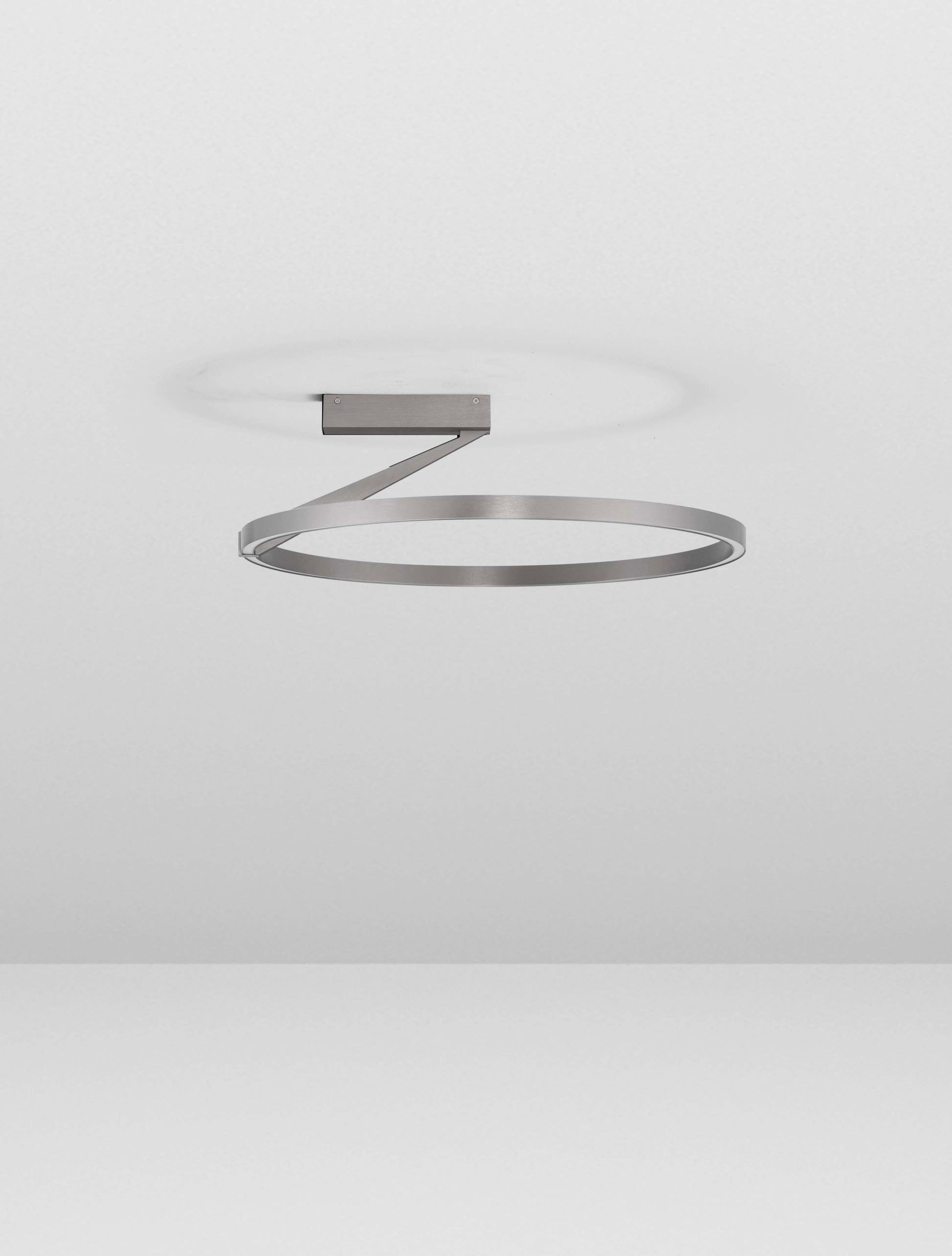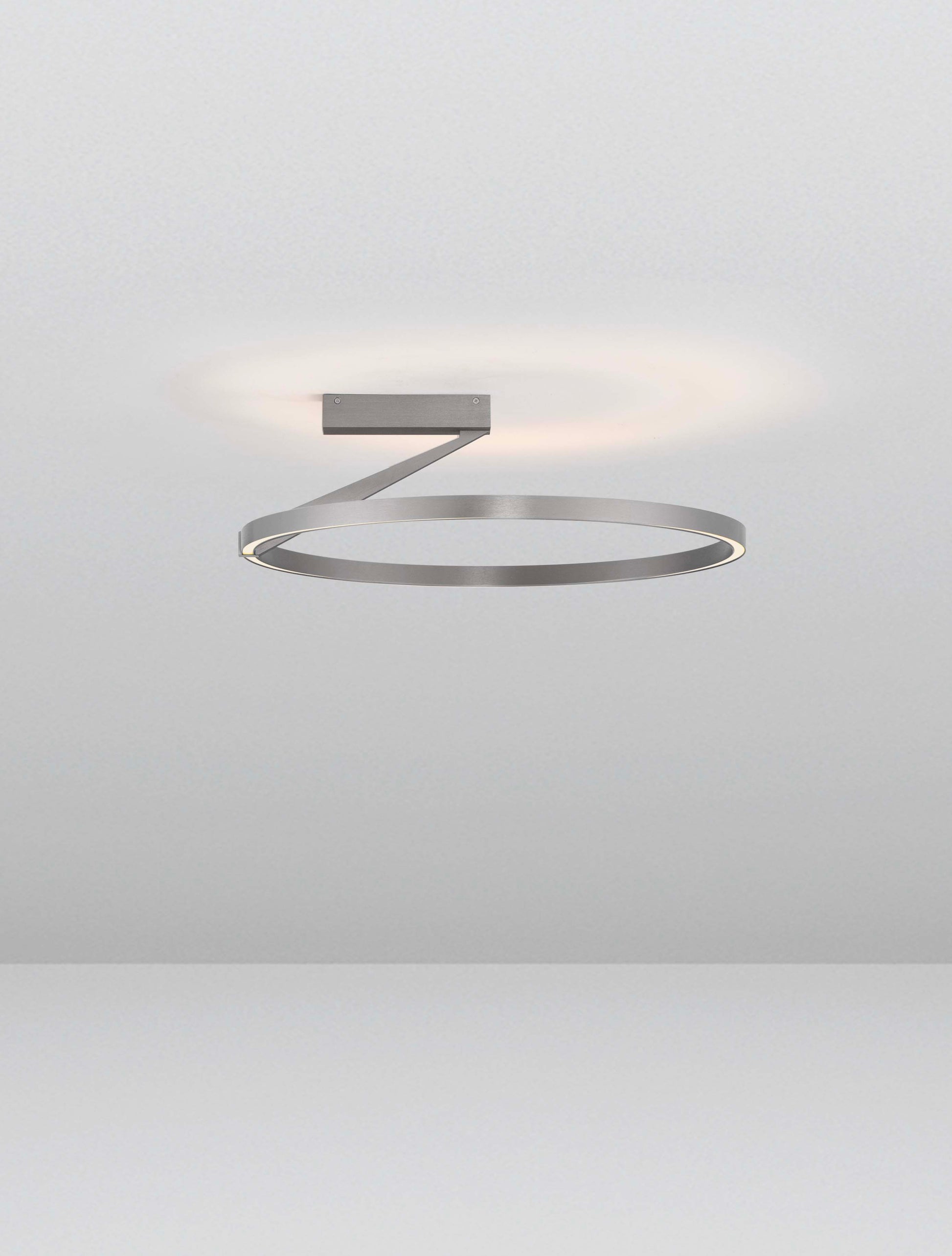 Lampen har en unik og iøynefallende design med en sirkulær form og en slank profil. Den bøstet nickel aluminiumen gir lampen et moderne og sofistikert utseende. Den enkle, men elegante designen gjør at lampen passer godt inn i ulike interiørstiler.